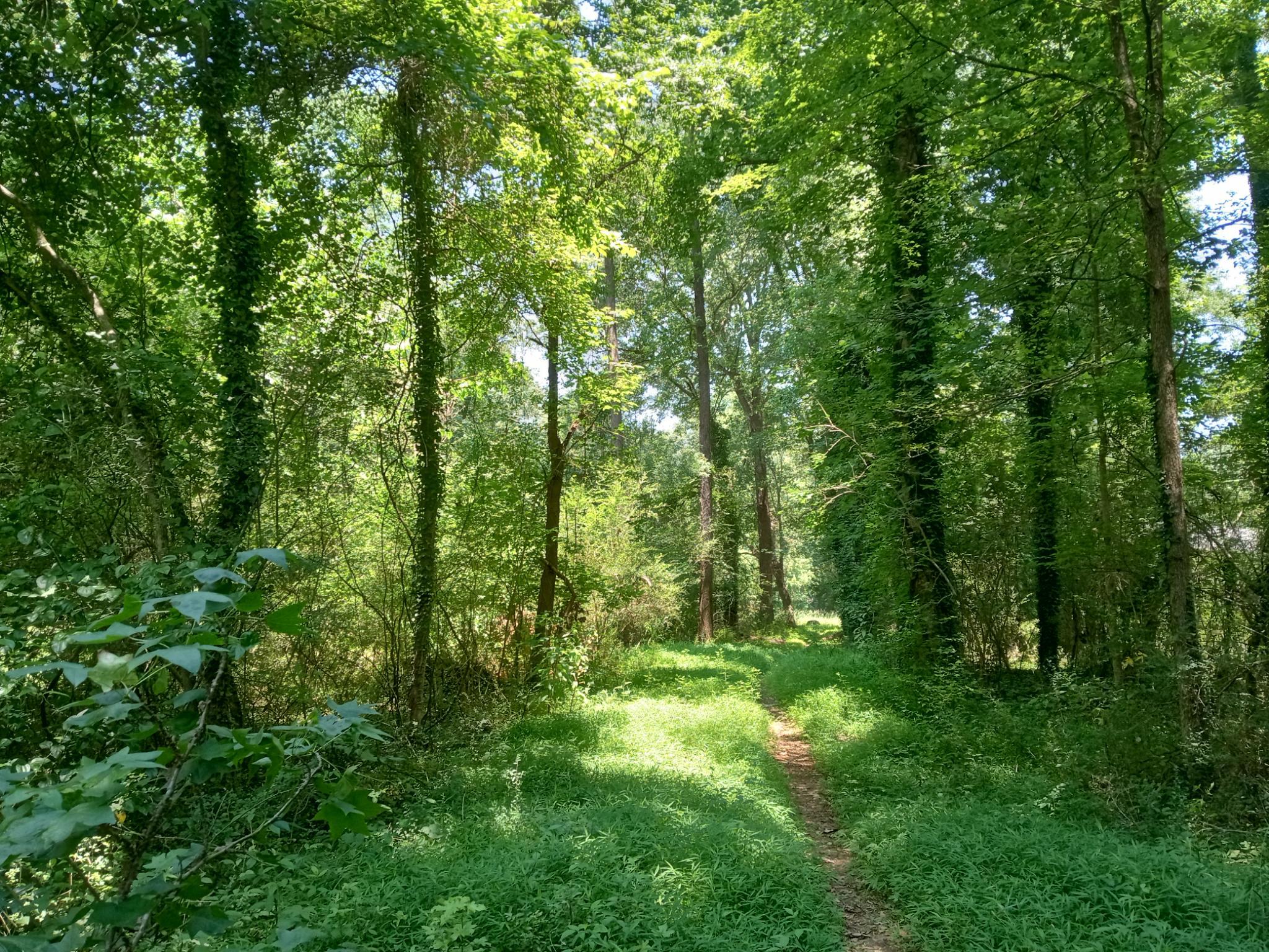 Looking ahead along the bike path toward Intrenchment Creek Park, I realized that we were closer to Weelaunee than we had been since March. Along the way, still opposite the tunnel into Intrenchment Creek proper, I started to recognize places I'd been during previous visits. I passed the bench where I sat with a dear friend during my first trip here: then still in the formative point of our friendship, we are now closely bound by our shared experiences in this struggle. A little ways further, I saw the clearing where an acquaintance from a previous week of action hung a hammock away from camp when they wanted space to themself. I found the spot where I once encountered a coiled king snake and, crouching near it, marvelled in the beauty of its deep black scales punctuated with bands of white. The different sections of the snake appeared as though they were moving in opposite directions despite being a unified body, seamlessly balancing and integrating contradictory tensions.